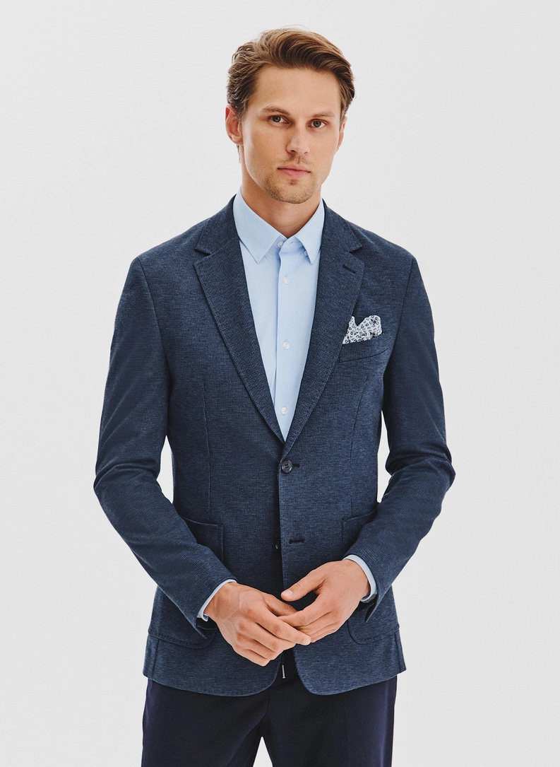 Tamsiai mėlynas trikotažinis švarkas skalikų dantų raštu