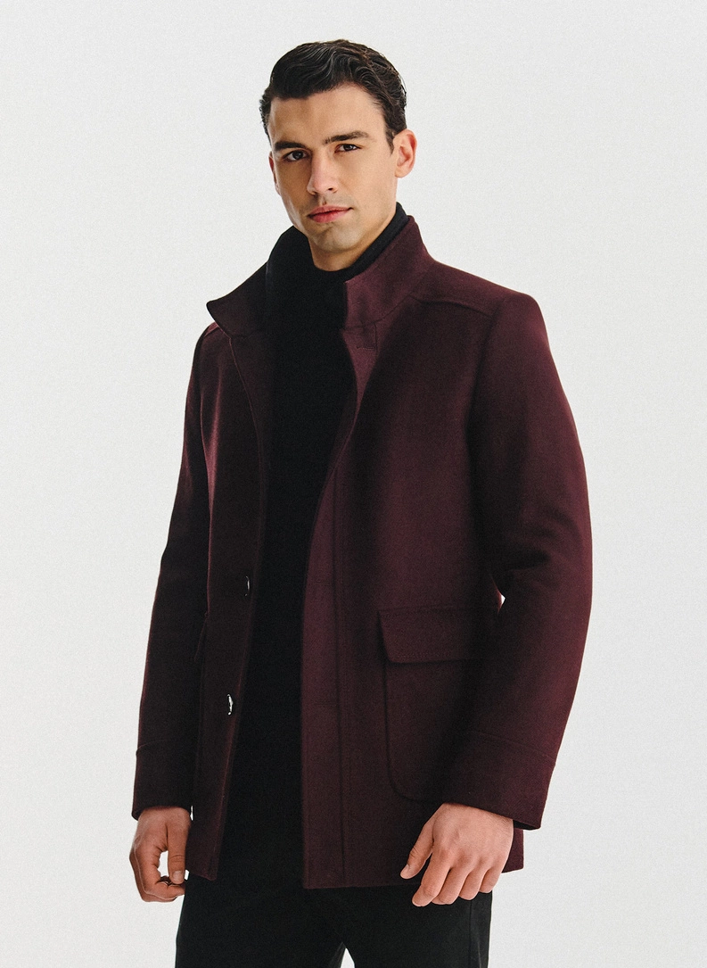 Tamsiai raudonas sagomis sagstomas lietpaltis