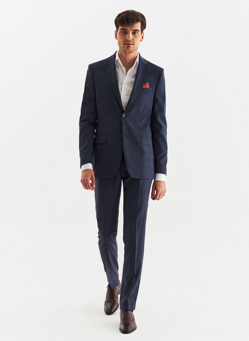 Vilnonis tamsiai mėlynas kostiumas su subtiliu čekiu