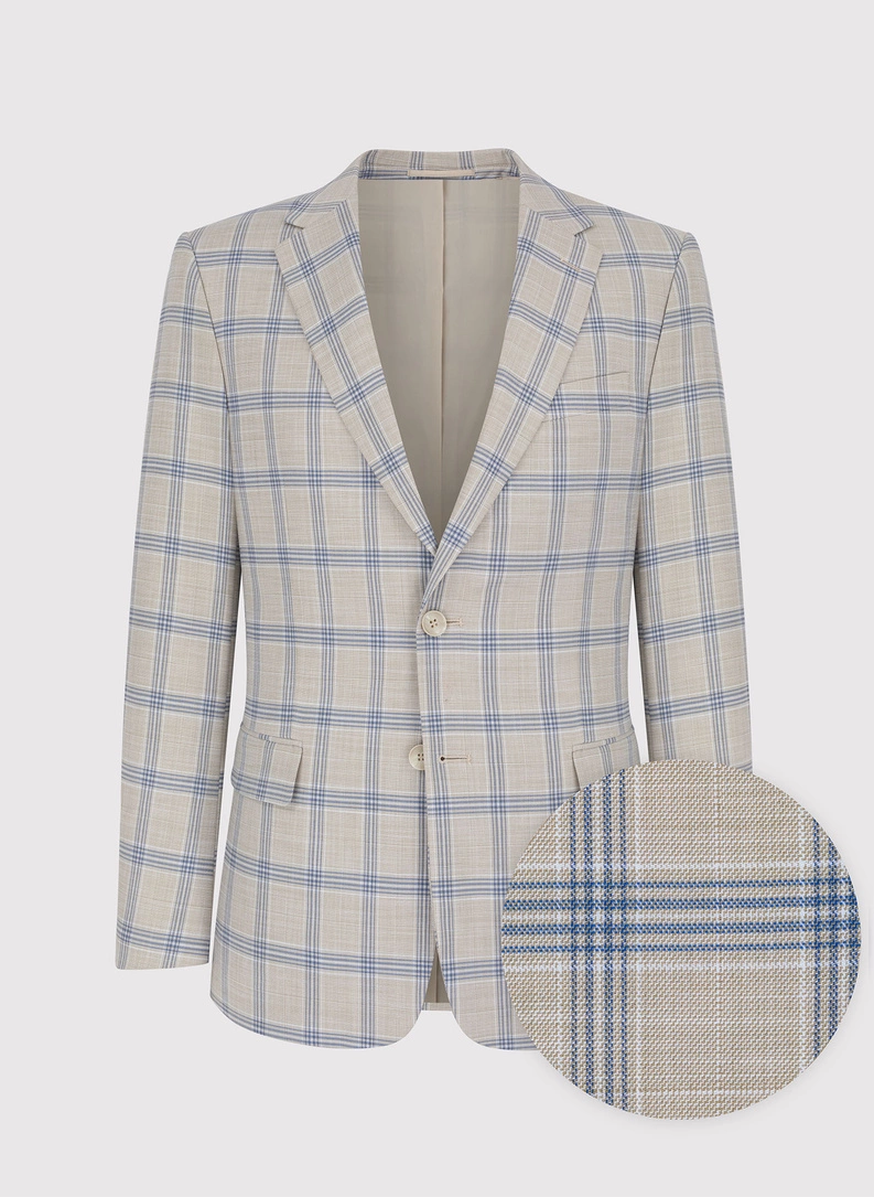 Smėlio spalvos kostiumas su mėlynu langeliu